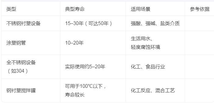 不銹鋼襯塑設備的使用壽命通常在15至30年之間,在理想工況下可延長至50年以上。具體壽命受材料選擇、工況條件、介質性質和維護水平等多重因素影響,不同配置和使用場景下差異顯著。